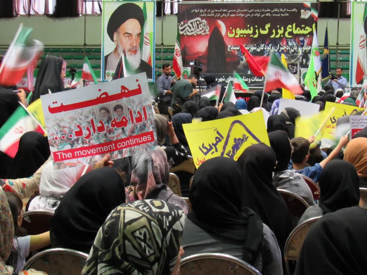 اجتماع باشکوه زینبیون با حضور گسترده بانوان در سالن آزادی سنندج برگزار شد و بانوان با شعارها و پوسترهای اعتراضی، حمایت خود را از آرمانهای مقاومت در برابر استکبار جهانی اعلام کردند.