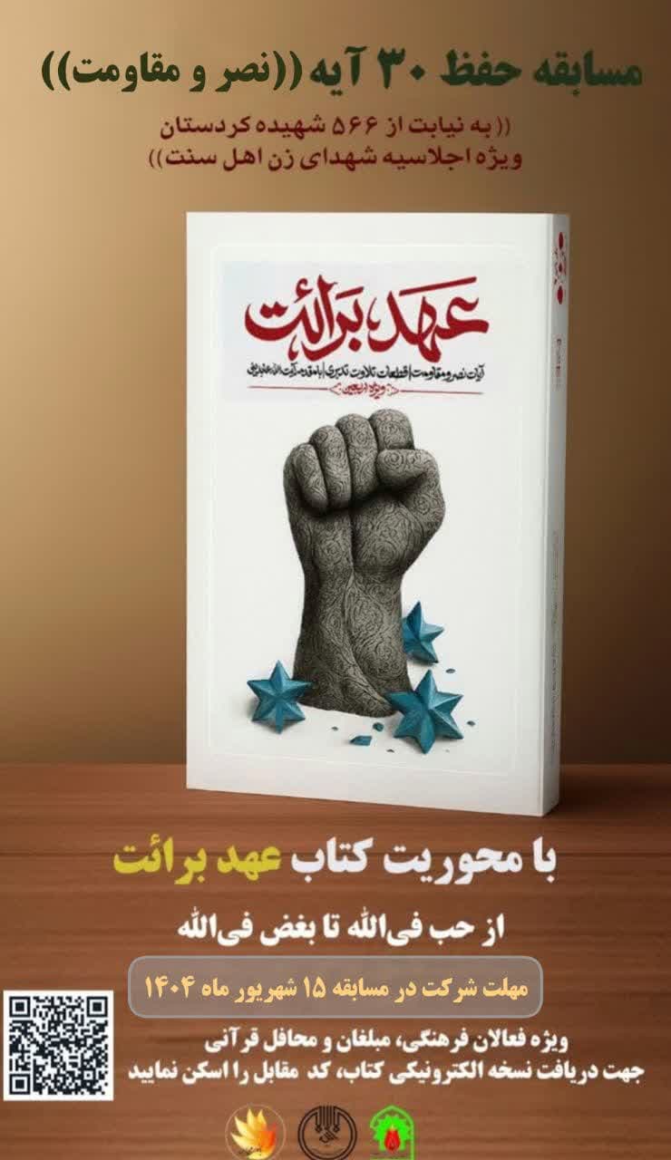دهقانی با تأکید بر اینکه «یاد شهدا چراغ راه آینده است و باید با فعالیتهای فرهنگی در دل نسل جوان زنده بماند»، تصریح کرد: علاقهمندان میتوانند با پاسخ به پنج پرسش طراحیشده در لینک اعلامی، در این مسابقه شرکت کنند و فایل کتاب «عهد برائت» را از طریق پایگاه اطلاعرسانی ادارهکل تبلیغات اسلامی کردستان یا کانال ایتا دریافت نمایند.